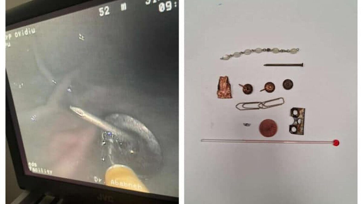 „În cursul săptămânii trecute, o parte din echipa de endoscopie a Spitalului Judeţean Suceava, formată din medicii gastroenterologi Rami Ababneh, Bucatariu Sidonia, Golea Andreea, asistenta Olariu Mirela, s-au confruntat cu un caz mai puţin obişnuit: un bărbat de aproximativ 55 de ani cu tulburări psihice a ingerat mai multe obiecte, unele ascutiţe, care puteau provoca complicaţii digestive, precum perforaţie intestinală sau ocluzie intestinală, şi trebuiau scoase, prin endoscopie digestivă superioară, cât mai repede, atât timp cât încă se mai aflau în stomac şi prima parte a intestinului subţire al pacientului”, au declarat reprezentanții spitalului din Suceava.